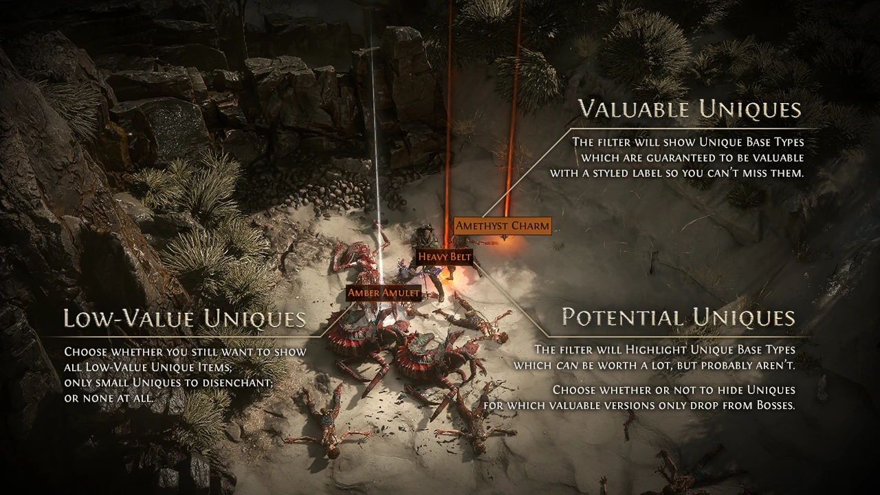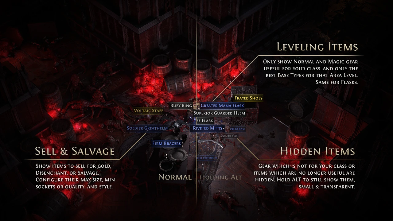 Halfway through the campaign, many items start dropping, most of which you won't be interested in for your character: Normal and Magic items, Weapons not usable by your build, and Armour which doesn't have the right defences. This filter hides them, always keeping a clean overview and adding to the game's beautiful atmosphere.